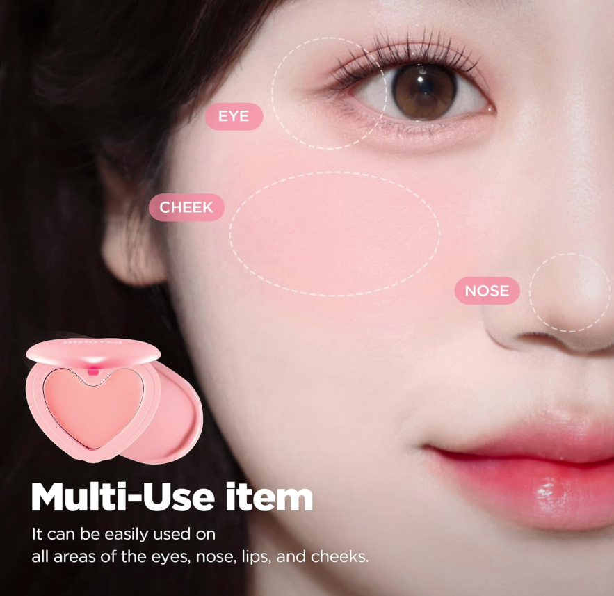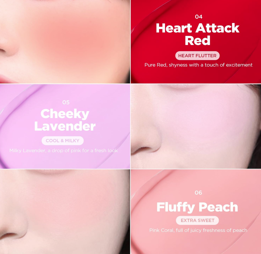 Take a moderate amount of blush with your fingertip or makeup puff, and gently apply and blend onto cheeks.
